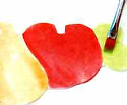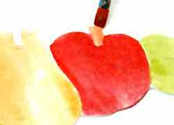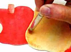 Curso de E.V.A: Pote de Frutas - passo 7 7. Pêra: Molhe a brochinha na tinta ocre e faça batidinhas leves na lateral da pêra, dando o efeito sombreado.