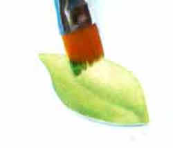 Com o pincel largo e a tinta verde claro, pinte todas as folhas.