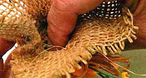 Corte um pedaço quadrado de juta de +- 10x10cm e alinhave o centro