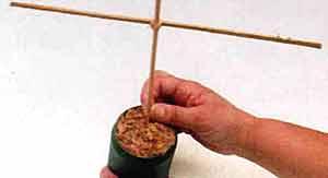 28. Montar Base do Espantalho:Coloque argila e musgo dentro da lata pintada Amarre os palitos de churrasco em forma de cruz e fixe na argila. | ||