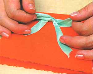 Posicione bem a capa sobre o bloquinho e passe a fita de cetim nos furinhos