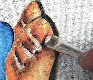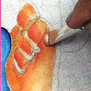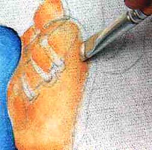 15. Com o pincel 815-12 e o ocre ouro, preencha o sapatinho sem atingir o cadarço e a sola.