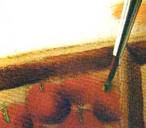 17. Dê profundidade às pêras aplicando com o pincel 815-2 a tinta verde oliva no lado direito de cada fruta.