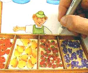 21. Com a caneta para tecido na cor marrom, contorno o feirante e a madeira.