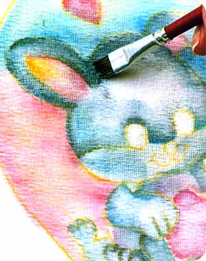 Com as cores cinza e azul água, esfumace e escureça o contorno do coelhinho
