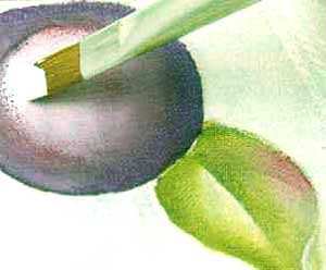 9. Passe o pincel 815-10 molhado em pouco clareador nos contornos das frutas e folhas.