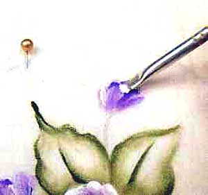 Para finalizar, com o pincel 0 e a tinta verde pinheiro, puxe filetes ao redor das flores para compor os galhinhos.