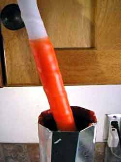 6º) Coloque o corante na cor de sua preferência na parafina derretida e mergulhe a tocha algumas vezes, até ficar na tonalidade desejada.