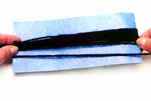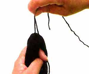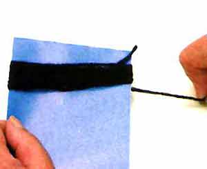 Curso de E.V.A: Fantoche - passo 15 16. Num papelão de 25cm de comprimento, enrole 40 voltas do fio de lã preto.