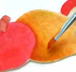 Curso de E.V.A: Pote de Frutas - passo 10 10. Cor da Maçã: Molhe a brochinha na tinta vinho e bata sobre a lateral da maçã.