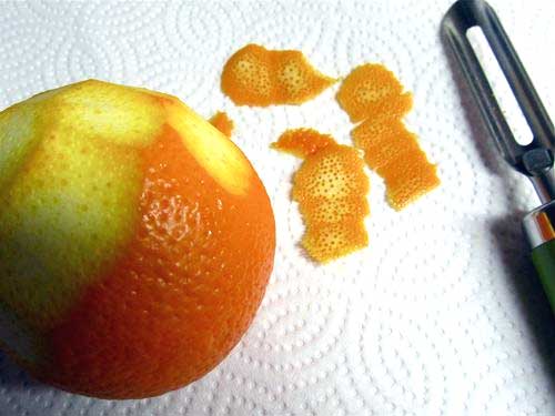 Para evitar o amargo Se a laranja tem casca grossa, precisa descascar e depois retirar a película branca da casca. Se a casca é fina, use um descascador que não pega a parte branca (veja a foto) |