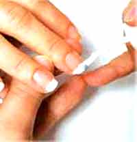 Francesinha Tribal - passo 2 2. Com o esmalte branco, faça uma faixa horizontal na ponta das unhas.